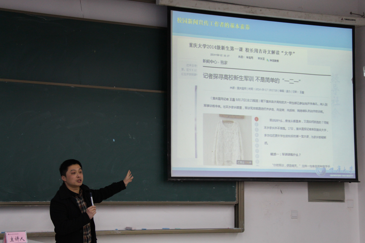重大城科新闻网12月17日电(传媒中心 陈籽函) 17日下午4时,学校开设“校园新闻宣传工作者的基本素养”专题讲座,对各二级部门、学院通讯员以及学生通讯员进行培训。会议邀请重庆大学党委宣传部徐方正老师担任主讲。此次会议由党委副书记胡新炼主持。