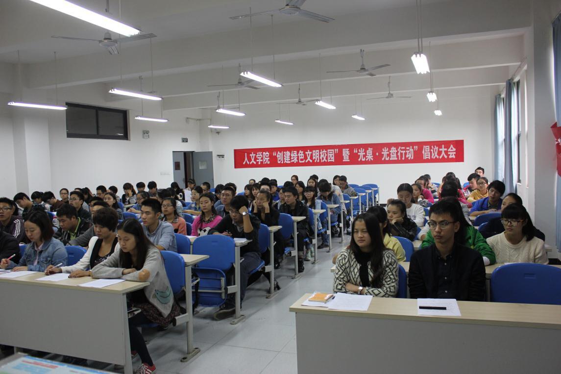 (重大城科新闻网12月2日电) 2014年10月30日中午12时30分,人文学院在五教107召开人文学院“创建绿色文明校园”暨“光桌光盘行动”倡议大会。本次“创建绿色文明校园”暨“光桌·光盘行动”由人文学院党总支主办,学生党支部承办。人文学院党总支副书记冯鑫、团总支书记步燕婷、全体师生党员、团学干部、全院班团干部出席本次大会。会议由学生党支部书记李卓兴主持。