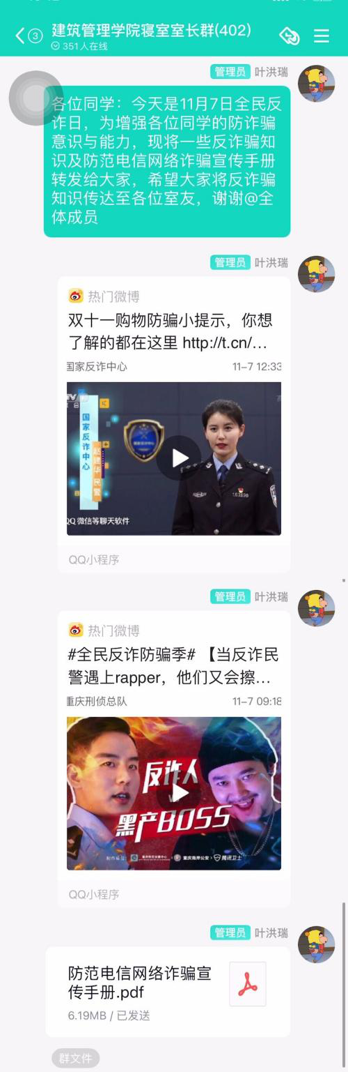 线上通过建管学院寝室长群宣传反诈骗知识,发挥建管学院网格化管理的优势和作用。