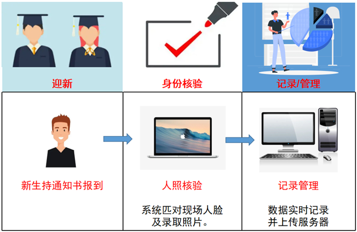 为落实教育部文件及上级主管部门学籍学历工作会议精神,建立健全学校新生入学资格审查机制,以人脸识别测温一体机和智慧招生大数据服务平台共同构建的全新“学生人脸识别报到系统”在今年迎新中起到了重要作用。