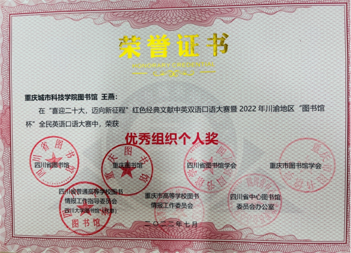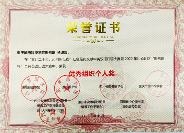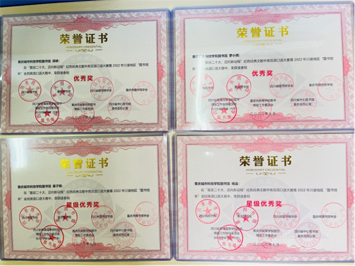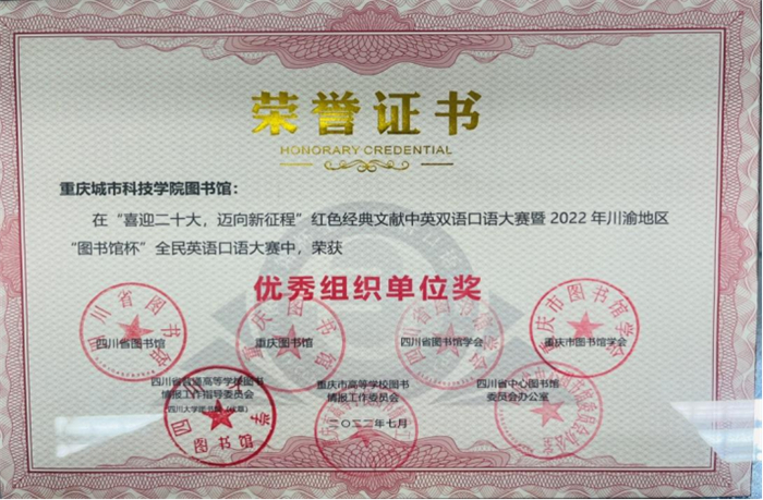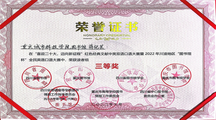 此次大赛共有263所高校组织赛事(四川185所,重庆57所),28836名选手参赛;经过网络初赛、网络复赛、现场总决赛各环节的激烈角逐后,城科参赛选手蒋宛芸荣获读者组三等奖;秦子杨、杨露荣获读者组星级优秀奖;邓娇、罗小燕荣获读者组优秀奖;重庆城科图书馆荣获优秀组织单位奖;马印普、王燕荣获优秀组织个人奖。