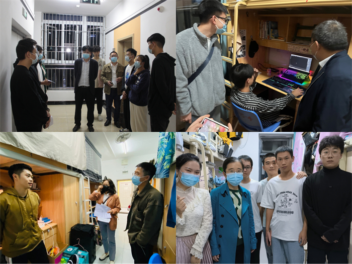 老师们进入宿舍楼后,检查楼内各项设施,排查宿舍安全隐患。在走访过程中,学院的领导和老师们亲切问询学生在宿舍线上学习的情况和困难;叮嘱学生要严格遵守学校防疫要求,坚持每日健康打卡,提醒学生们注意宿舍安全用电,同时就同学们在此期间学习和生活上遇到的问题,与同学们进行耐心的沟通交流。教师们有的向同学们介绍学院的建设历史和专业发展方向,有的对同学们的大学生活和专业学习给予经验指导;有的鼓励同学们扎实学好专业知识,在今后的专业领域有所收获,有所发展。同学们对老师们的到来感到十分激动,纷纷表示在疫情防控期间一定认真遵守学校疫情防控政策,学习上努力做到不松懈,与学院一起共克时艰。