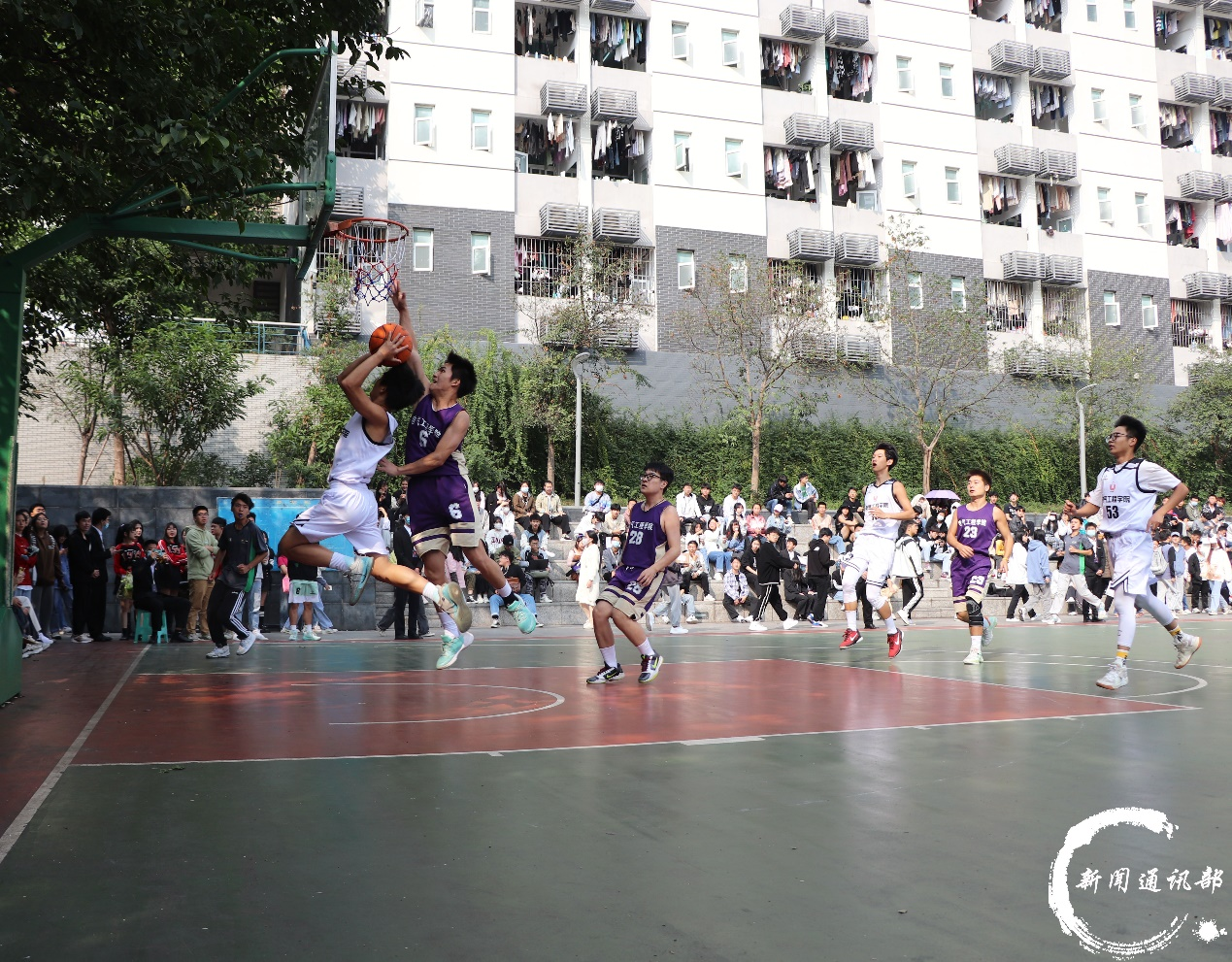 本次赛事共有6支队伍进入决赛,共进行3个场次,组织井然有序,过程精彩纷呈。球场上,心有灵犀的攻防配合、行云流水的快攻上篮随时可见,前锋、中锋、后卫,球员们穿梭于人声鼎沸的球场,任汗水流淌湿透球服,酣畅淋漓,拼搏热血,奋勇争先。“我们是一个队”率先抢夺首球,迅速取得领先优势,“有请下一队”不甘示弱,紧追其后,防守攻击不断变换,观众被篮球的魅力所吸引,呐喊助威声此起彼伏。最终, “我们是一个队”斩获冠军。“有请下一队”虽然与冠军失之交臂,但是拥有强健体魂和良好心态,才会是人生赛场上永远的冠军。