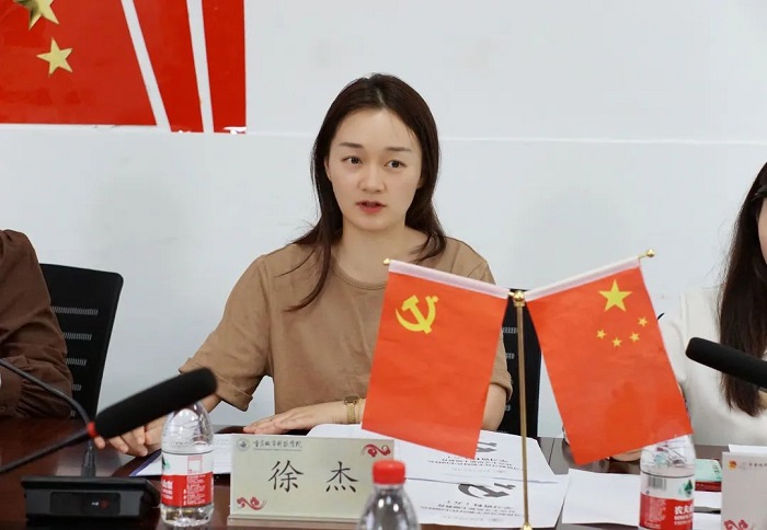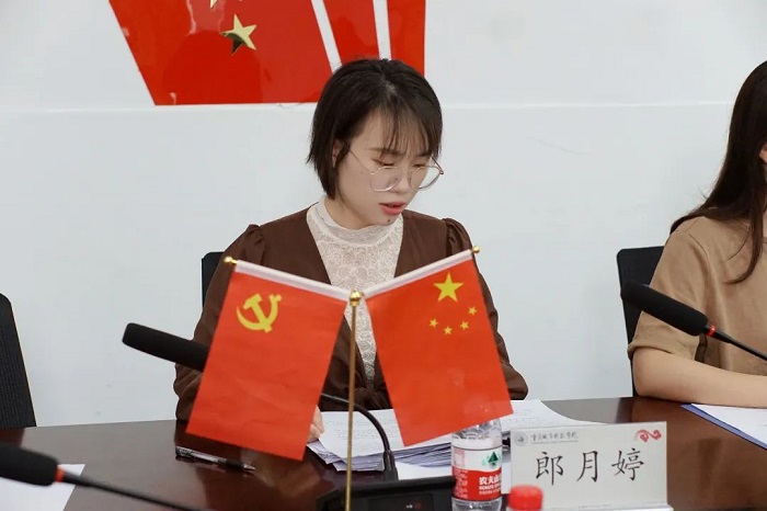 学生第一党支部书记郎月婷领学《袁家军主持召开重庆内陆新通道会议》的相关内容,她提到要完整、准确、全面贯彻新发展理念,积极融入和服务新发展格局,高水平推进建设西部陆海新通道,奋力谱写新时代内陆开放高地建设新篇章。