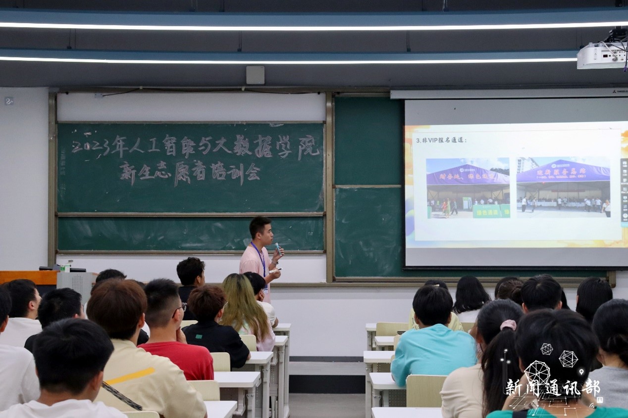 为确保2023级新生报到相关工作顺利开展,保障迎新工作服务高效、安全、有序进行。9月14日14:00,人工智能与大数据学院正式开展为期两天半的本科迎新工作。人工智能与大数据学院党总支书记张念,党总支副书记唐继龙,全体新生辅导员以及迎新志愿者共同参加此次迎新活动。