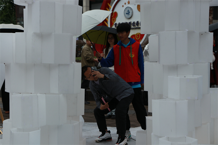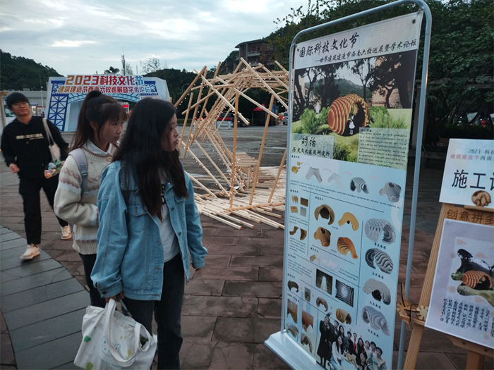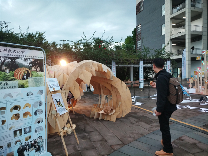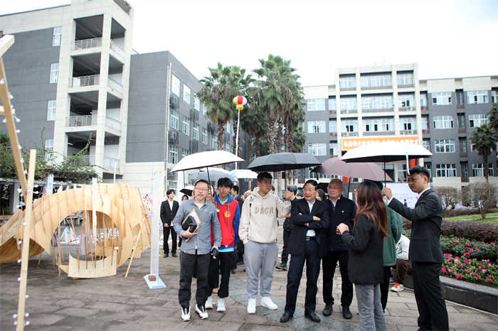 开幕式结束后,领导和嘉宾在工作人员的带领下参观了建造节的作品,在现场与参赛选手展开热烈交流,就材质与设计灵感展开探讨,通过设计到施工到落地展演的过程,把课堂中的课堂设计搬到现实场景应用,得到来自各高校、企业和地方科协的共同评审,是一次专业与实践育人模式的探索。