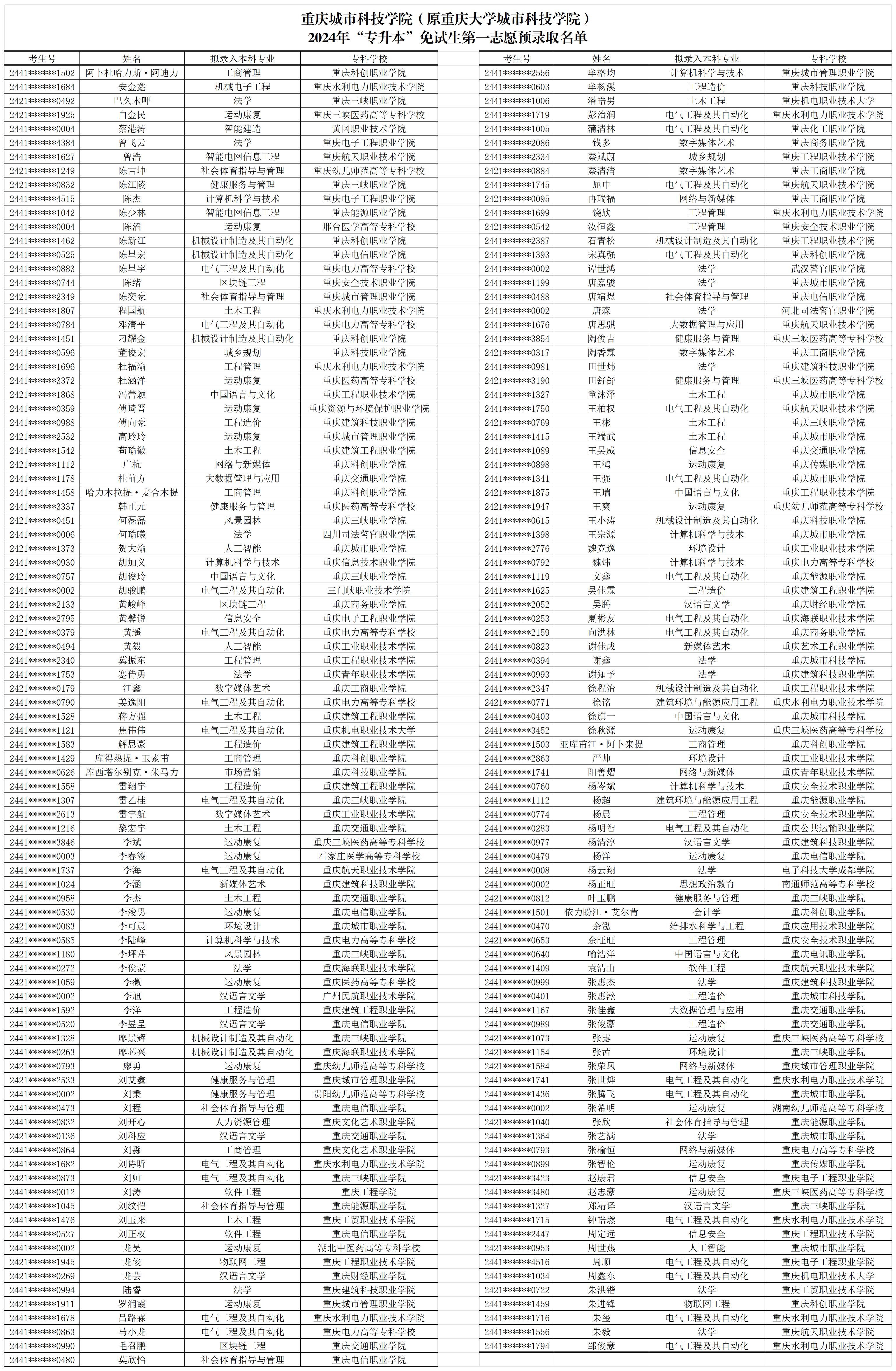 根据《重庆城市科技学院2024年“专升本”免试招生章程》,现将2024年“专升本”免试生第一志愿预录取名单予以公示(公示5天),公示名单附后。最终录取结果以上级主管部门录取审核通过为准。
