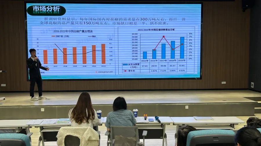 在比赛现场,8个参赛团队轮流上场,围绕比赛主题,结合自身专业知识,结合PPT展示、视频演示等多种方式,多角度展示自己团队的项目构想。展示环节完成后,评委对各个团队进行提问。展示及答辩过程中,选手们沉着冷静,语言表达简明扼要,条理清晰。评委老师们结合项目实际,从市场调研、竞争优势、盈利方式等方面提出问题,并给予针对性的改进意见,为项目团队指明了方向。