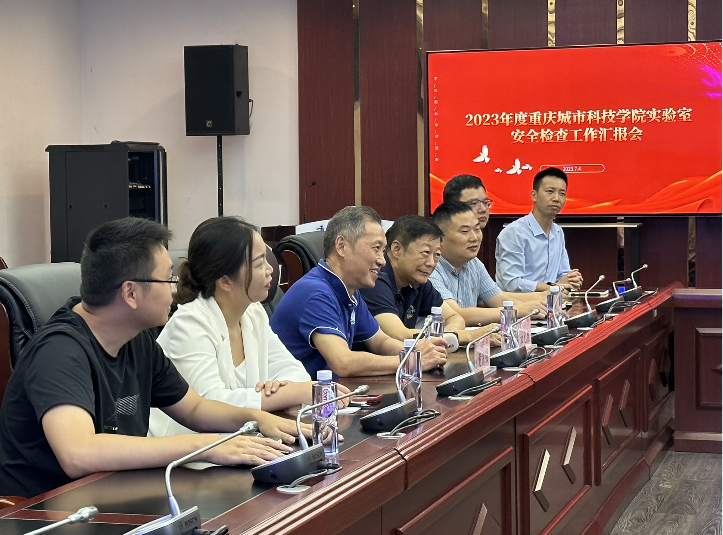 2023年7月4日下午16:00,重庆市教委委派以重庆轻工业职业学院院长兰刚为组长的专家组4人来重庆城市科技学院开展实验室安全现场检查工作,检查工作汇报会及反馈会在重庆城市科技学院第一行政楼101会议室举行,校长黄宗明、副校长杜元虎、现代教育技术中心、教务处、后勤保卫处、各二级学院负责人及实验中心主任参加此次汇报会和反馈会。