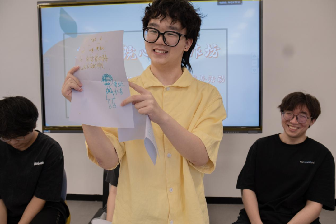 成员通过分享情绪体验达到认识和调适情绪的目的。在活动中成员分享成长道路上的各种情绪体验或困扰,包括生活、学习、人际交往和个人成长等方面。在团体带领老师的引导下,成员们通过手绘情绪、成败体验等游戏环节,剖析并总结了情绪的一般特征和规律,在特征与规律中共同寻找情绪管理的方法。在最后两次活动中,成员们通过有趣的游戏互动,在体验中学习和掌握实用的情绪调适技巧,提升自我调控能力。
