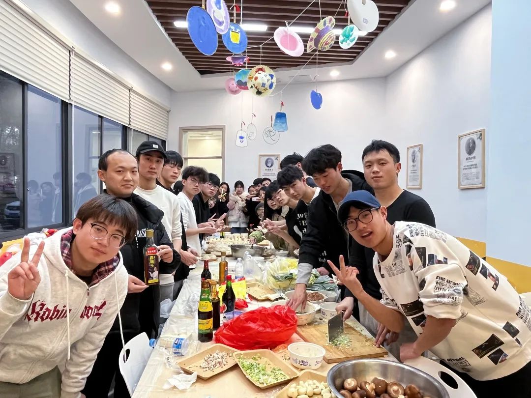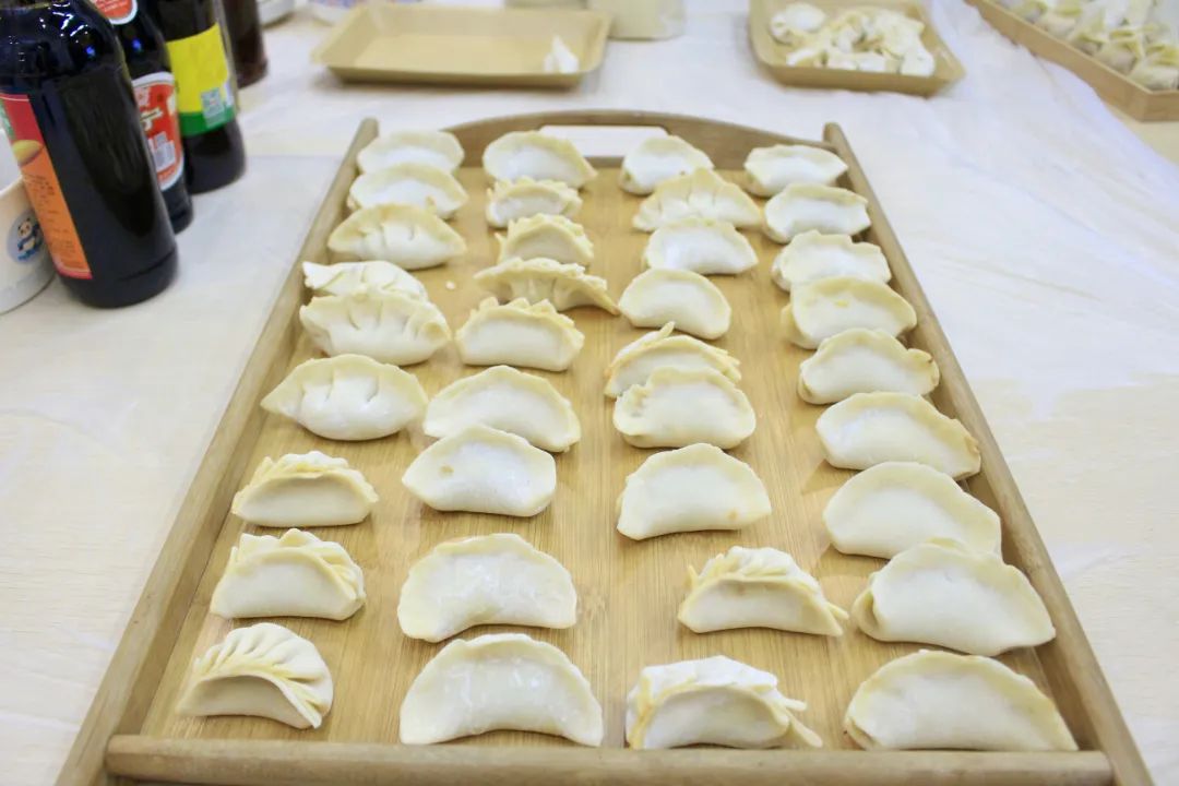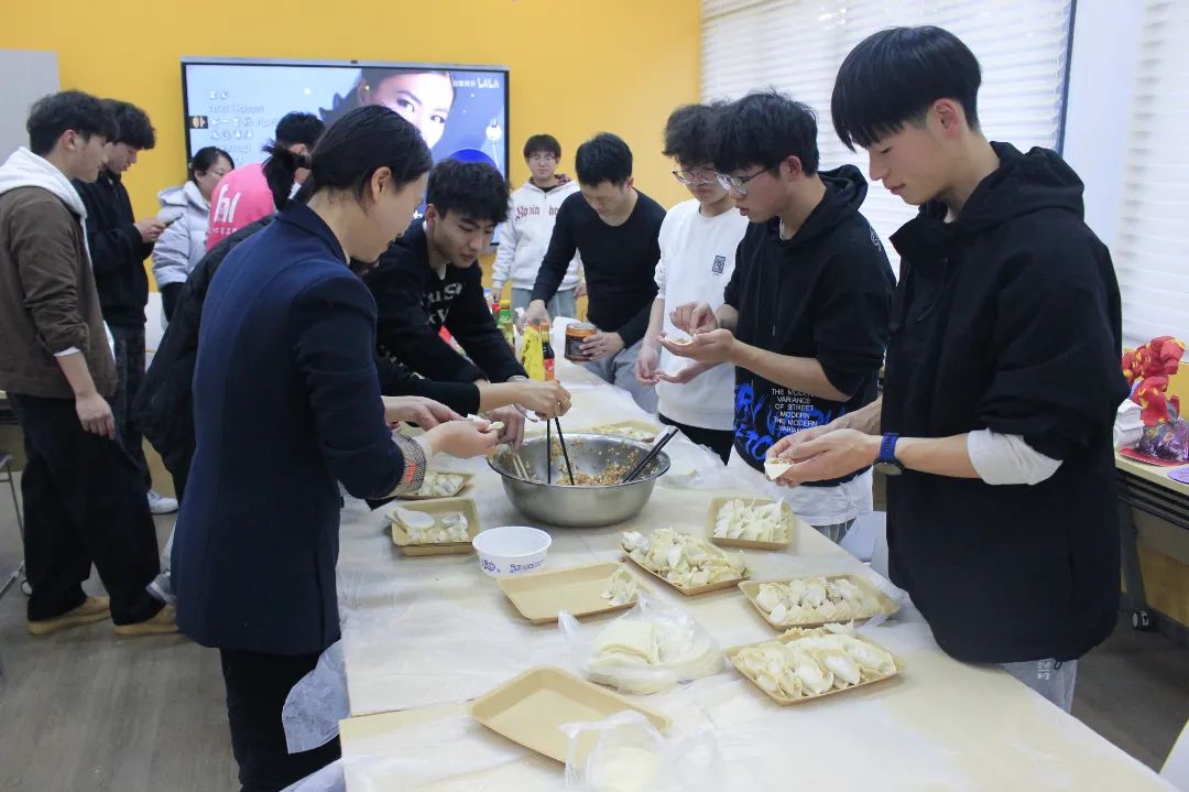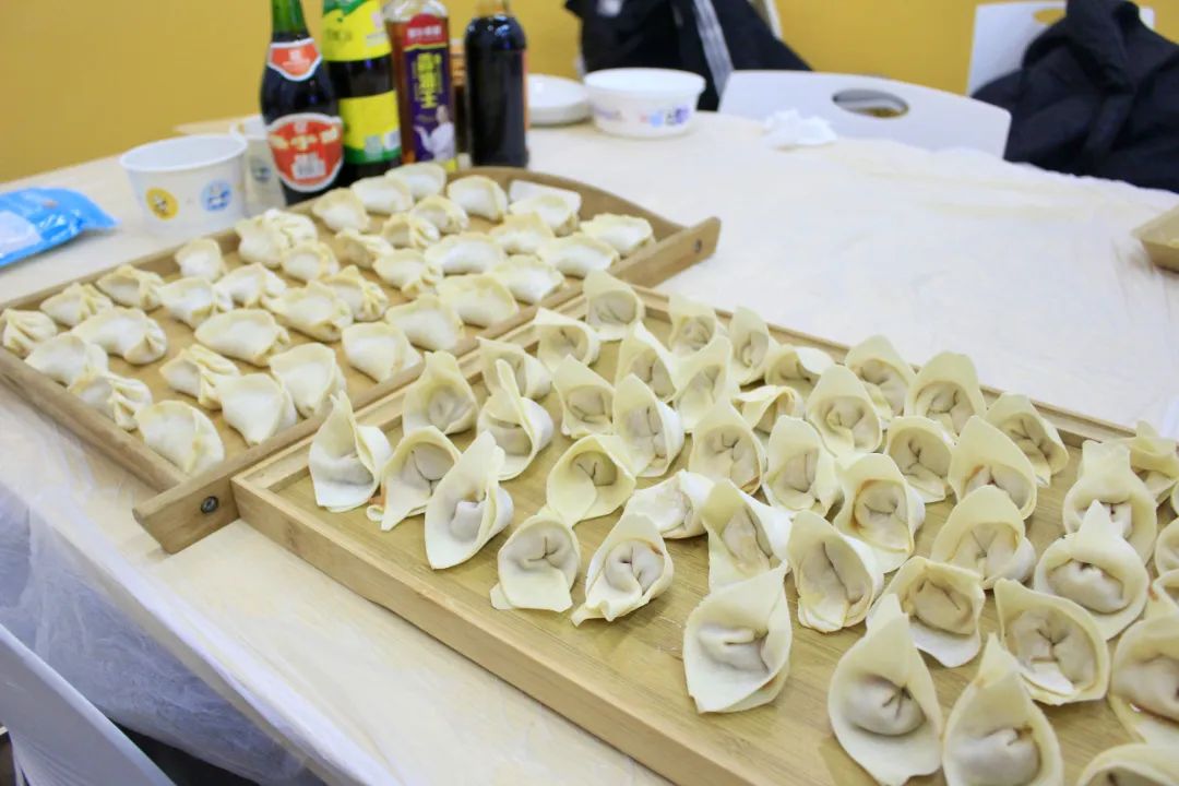 接着撸起袖子,热火朝天地包饺子。老师们手法娴熟,左手托面皮,右手执筷,对折捏边,细细收口,一捏一按之间,一个个饱满的饺子如灵动的精灵在手中诞生。而同学们各有千秋。有的同学经验丰富,又好又快地包出一个个外形漂亮的饺子,形似元宝、小船;有的同学经验不足,只能先学后用,包出了富有个性的饺子。他们虚心请教,逐渐掌握技巧,包出的饺子也有模有样。现场其乐融融、热闹非凡,洋溢着幸福的味道,充满着家的温馨。