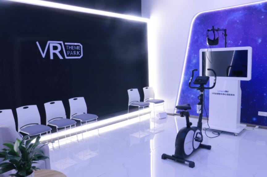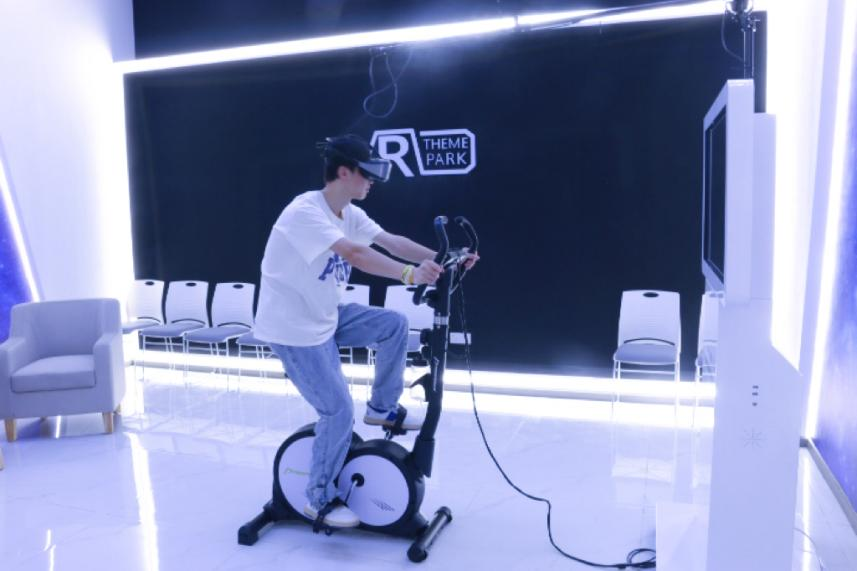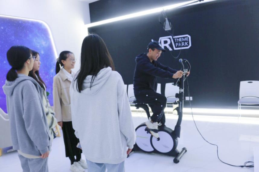 骑动感单车,做单人训练游戏,佩戴VR头显,在大屏幕前配合场景、游戏、音乐等形式,同学们体验了心理训练的神奇。