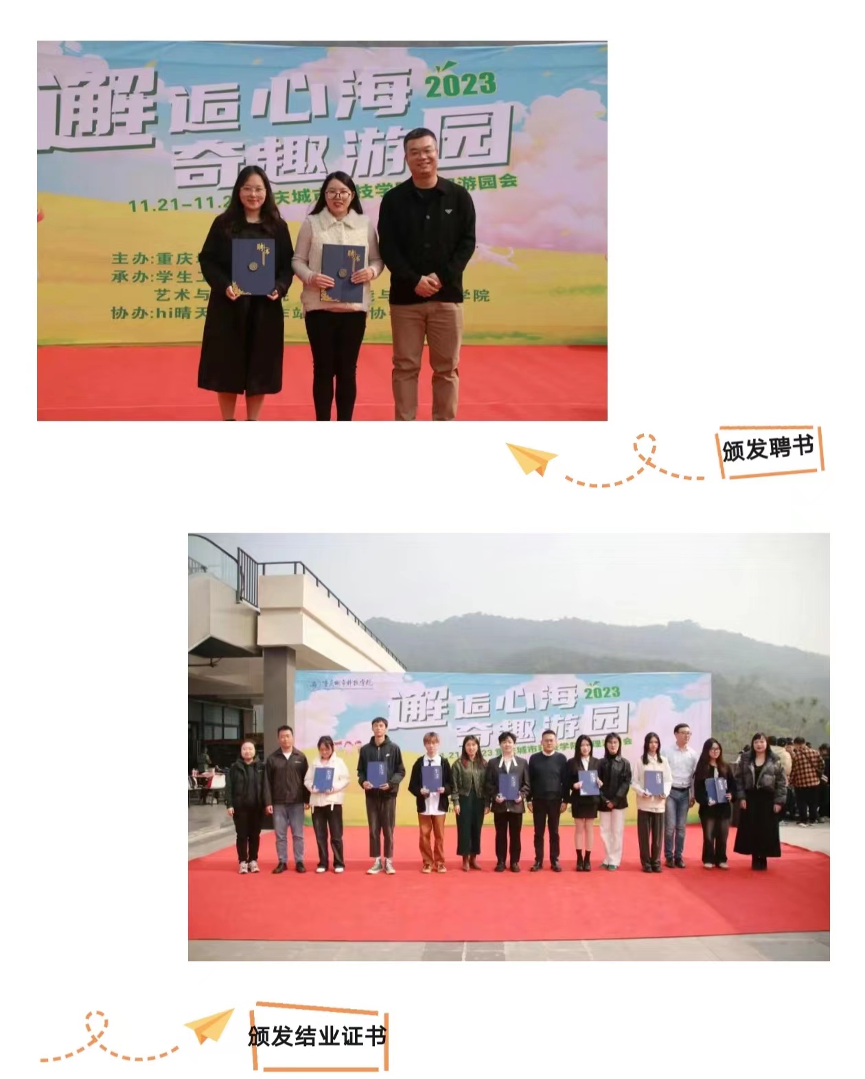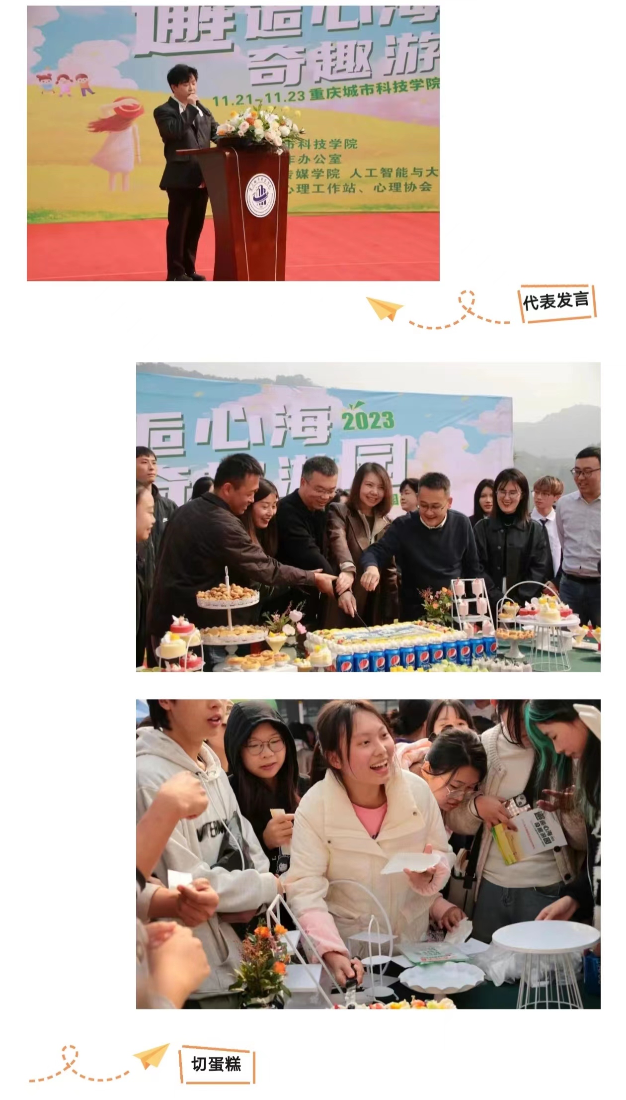 接下来,各位领导为各二级学院兼职心理健康教师颁发聘书,并为心理委员代表颁发结业证书。心理委员何文广同学代表心理委员进行了发言,何同学表示,心理委员是学校心理工作关键的一环,希望之后各位心委共同努力,更好地为同学们服务,也表达了对本次游园会活动的期待。最后,各位领导共切蛋糕,第八届心理游园会开幕式在一片欢声笑语中圆满结束。