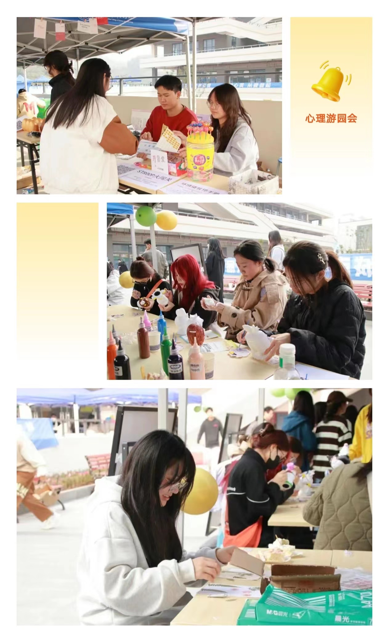丰富多样的活动吸引了同学们的积极参与,活动现场气氛热烈。希望通过本次活动,营造健康和谐、文明向上的校园氛围,培育学生自尊自信、理性平和、积极向上的健康心态,增强同学们自我关怀与互帮互助的意识,进一步推进我校心理育人工作,共建美好生活社区。
