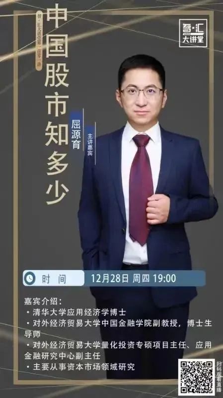 01主题讲座 中国股市知多少 02主讲教授 屈源育 清华大学应用经济学博士 对外经济贸易大学中国金融学院副教授 博士生导师 对外经济贸易大学量化投资专硕项目主任 应用金融研究中心副主任 主要从事资本市场领域研究 03讲座详情 时间:12月28日 周四 19:00 观看方式:一键扫描观看直播(可回放)