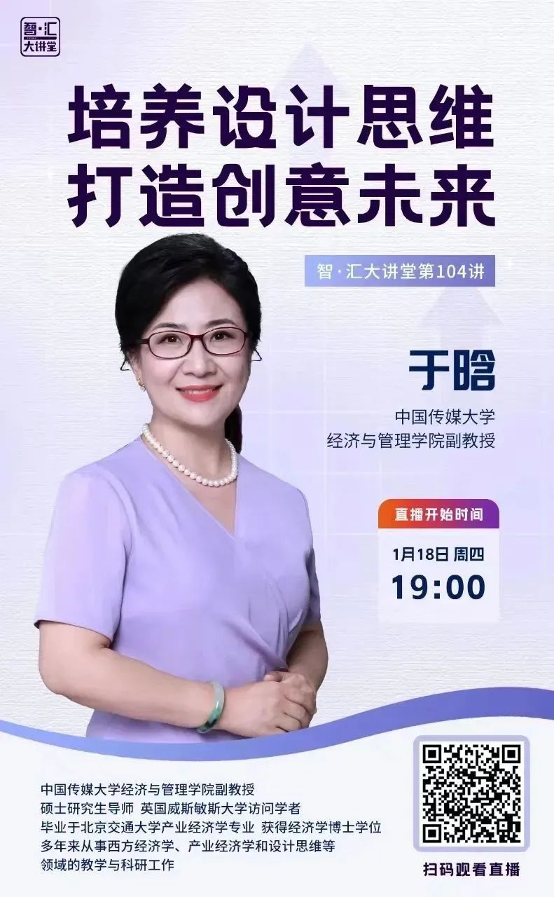 01主题讲座 培养设计思维,打造创意未来 02主讲教授 于晗 中国传媒大学经济与管理学院副教授 硕士研究生导师 毕业于北京交通大学产业经济学专业 获得经济学博士学位 英国威斯敏斯大学访问学者 多年来从事西方经济学、产业经济学和设计思维等领域的教学与科研工作 03讲座详情 时间:11月9日 周四 19:00 观看方式:一键扫描观看直播(可回放)