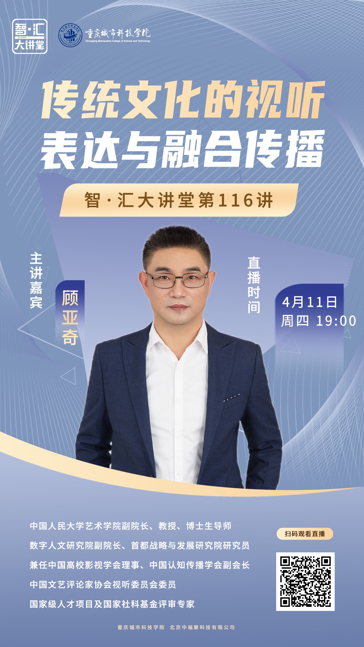 01 主题讲座 传统文化的视听表达与融合传播 02 主讲教授 顾亚奇 中国人民大学艺术学院副院长、教授、博士生导师 数字人文研究院副院长、首都战略与发展研究院研究员 兼任中国高校影视学会理事、中国认知传播学会副会长 中国文艺评论家协会视听委员会委员 国家级人才项目及国家社科基金评审专家 03 讲座详情 时间:4月11日 周四 19:00 观看方式:一键扫描观看直播(可回放)