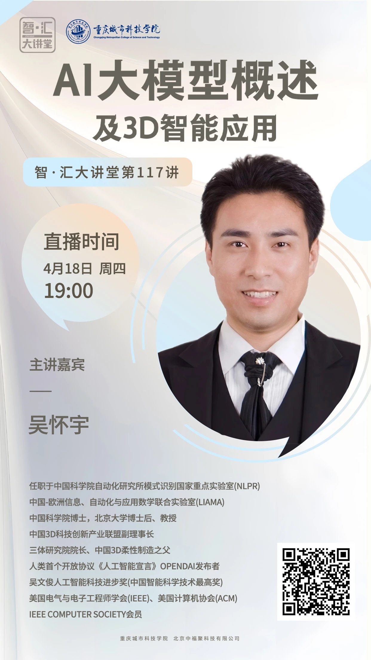任职于中国科学院自动化研究所模式识别国家重点实验室(NLPR),中国-欧洲信息、自动化与应用数学联合实验(LIAMA)中国科学院博士,北京大学博士后、教授中国3D科技创新产业联盟副理事长、三体研究院院长、中国3D柔性制造之父、人类首个开放协议《人工智能宣言》OpenDAI发布者、吴文俊人工智能科技进步奖(中国智能科学技术最高奖);美国电气与电子工程师学会(IEEE)、美国计算机协会(ACM)、IEEE Computer Society会员。