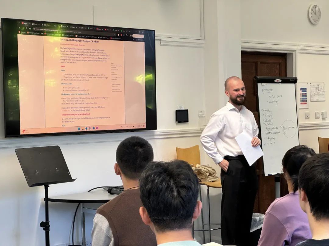 Dr. John以其深厚的学术背景和丰富的教育经验,为学员们呈现了一场关于英国诗词文学与研究方法的精彩讲座,学员们积极地与导师交流,并认真聆听导师的指导意见。