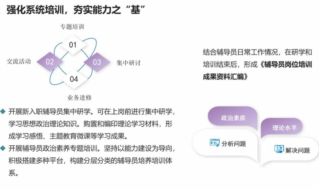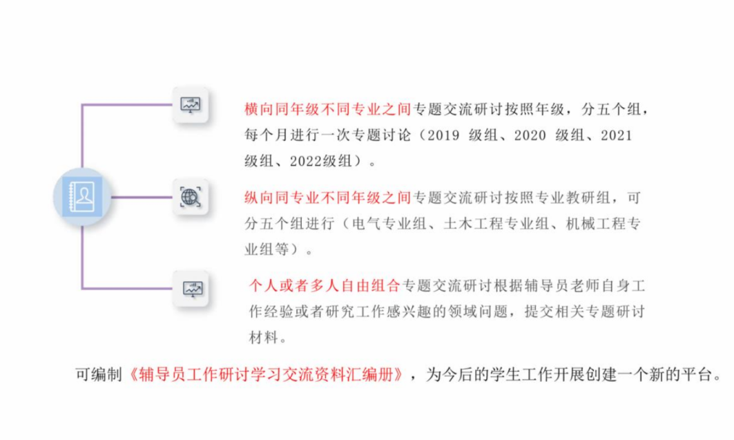 思想政治引领中心曾配源老师提出以新入职辅导员集中研学、辅导员政治素养专题培训、组建辅导员分类研讨团队、学生工作经验交流展示为抓手,逐步推进辅导员队伍专业化发展,并将培训结束后的学习感悟、微课等学习交流资料汇编成册,打造具有思想政治教育引领辐射作用的阵地和展示辅导员风采的窗口,进一步深化育人情怀,树立终身学习理念。
