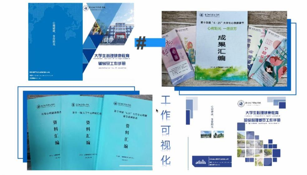 心理健康教育与咨询中心曾朝红老师在心理咨询、心理危机干预的流程可视化和“5.25”大学生心理健康节系列活动资料汇编的成果可视化基础上,提出了对辅导员和班级心理委员工作指导的可视化,通过下发相应工作手册,直观化地指导辅导员、班级心理委员开展心理工作,共同提升心理育人质量。