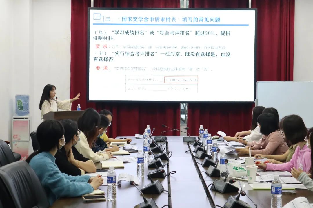 培训会上,胡迦老师首先对本年国家奖助学金评审工作做出了详细的说明,主要讲解了评选条件、评审程序、材料填报和审核要点,并以《国家奖学金申请审批表》为例,向与会人员详细说明了材料填报细则和常见的填写问题,希望各学院把握好工作进度、工作时间和工作程序,秉持严谨细致的态度认真完成此次国家奖助学金的评审工作。