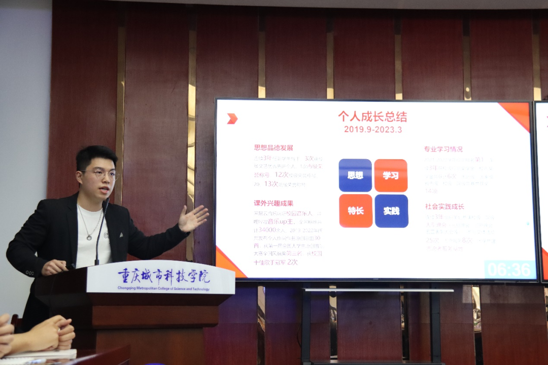 本次答辩会由学生处学生管理主管胡迦老师主持。答辩开始前,主持人先介绍了答辩规则和注意事项。接下来进行候选人答辩,本环节首先播放了推荐人视频,紧接着候选人从思想表现、学业成绩、获得荣誉、科技创新、文体竞赛、社会实践等方面进行PPT图文论述和汇报,然后评委就候选人汇报进行提问,候选人进行回答。