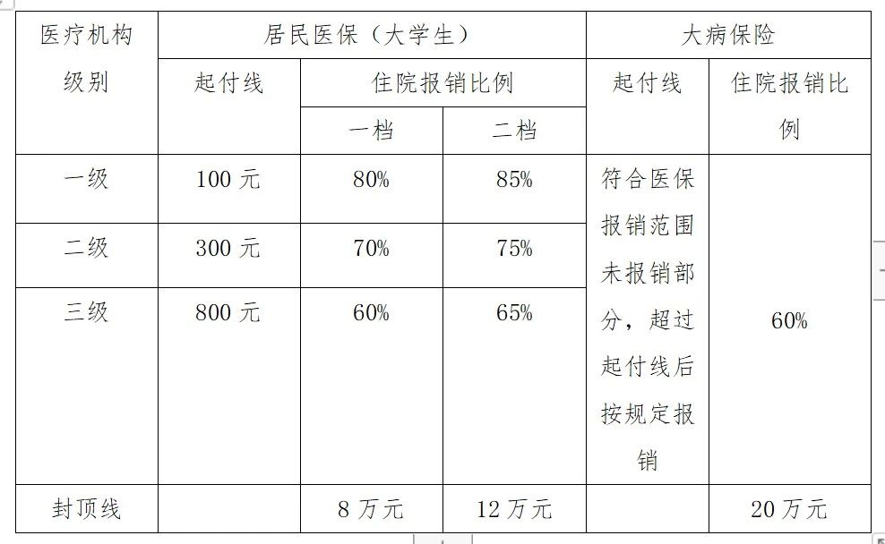 大学生医保在享受普通门诊、特病门诊、普通住院、产前检查和住院分娩等普通居民医保报销基础上,增加了大学生意外伤害门诊,意外伤害门诊报销封顶线为1000元/人·年。