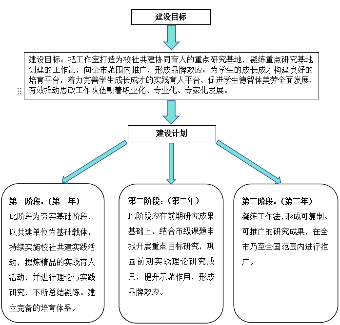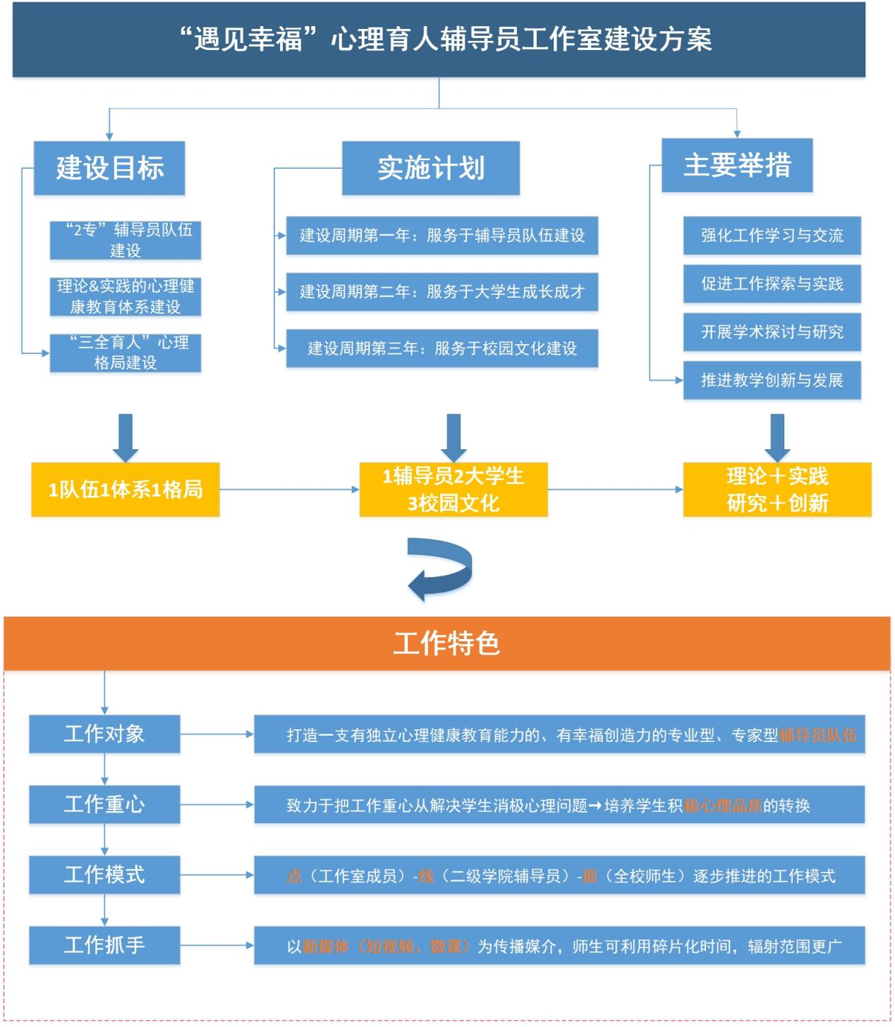 “遇见幸福”心理育人辅导员工作室以立德树人为根本任务,针对我校当前心理健康教育工作的空白或薄弱环节,主要以提升辅导员心理健康教育能力和心理健康水平,最终增强学生心理问题解决和适应能力、培养学生积极心理品质、激发学生内在动力为建设目标,同时满足辅导员职业化、专业化、专家化发展需求,着力打造有“幸福创造力”的辅导员专家队伍、“有心理底蕴”的辅导员名师工作室。