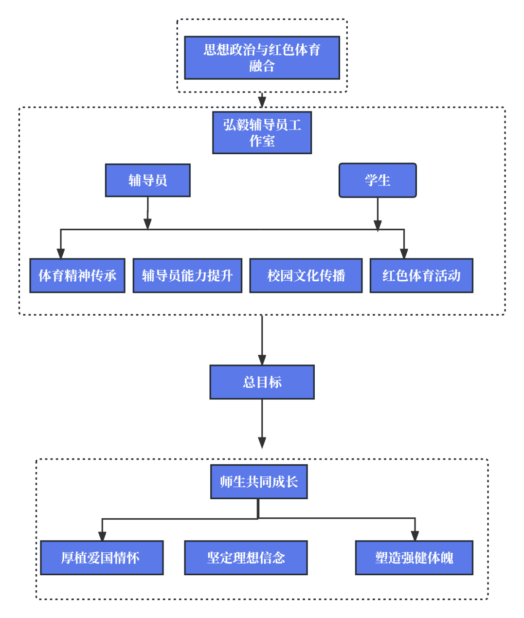 “弘毅”辅导员工作室以习近平新时代中国特色社会主义思想为指导,聚焦“立德树人”根本任务,促进学生身心健康发展和提升育人实效为总体目标。围绕体育时代传承价值:铸魂育人、全民健身、文化构筑等内容,运用思政引领、党团活动、体育赛事等多元化载体,挖掘红色体育文化对学生的积极影响和对思政教育工作的重要作用。充分发挥“辅导员+专业教师”全方位育人优势,为学校“为党育人、为国育才”的教育事业高质量发展贡献力量。