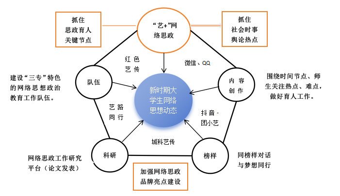 “艺+”网络思政工作室由艺术与传媒学院党总支书记陈宣君主持,成员包括马院、学校宣传、学院辅导员等高校思想政治工作一线人员。本工作室围绕立德树人这一根本任务,形成微信公众、抖音、微博等多维矩阵,抢占网络思想政治教育阵地,引领思想政治教育,持续增强学院网络思想政治工作的吸引力和实效性。通过聚焦网络思政育人,结合学院的思政、党建、团学、日常、宣传工作,创建具有艺术与传媒学院特色的网络思政教育,力将线下活动的开展与线上宣传相结合,通过实践、研究、再研究的方式,力求统一协调网络育人空间,建设艺术与传媒学院网络思想政治教育新媒体品牌,构建网络思政育人工作格局,探索出新时代高校网络思想政治教育工作新途径、新方法,最终达到创建市级辅导员工作室的目标。