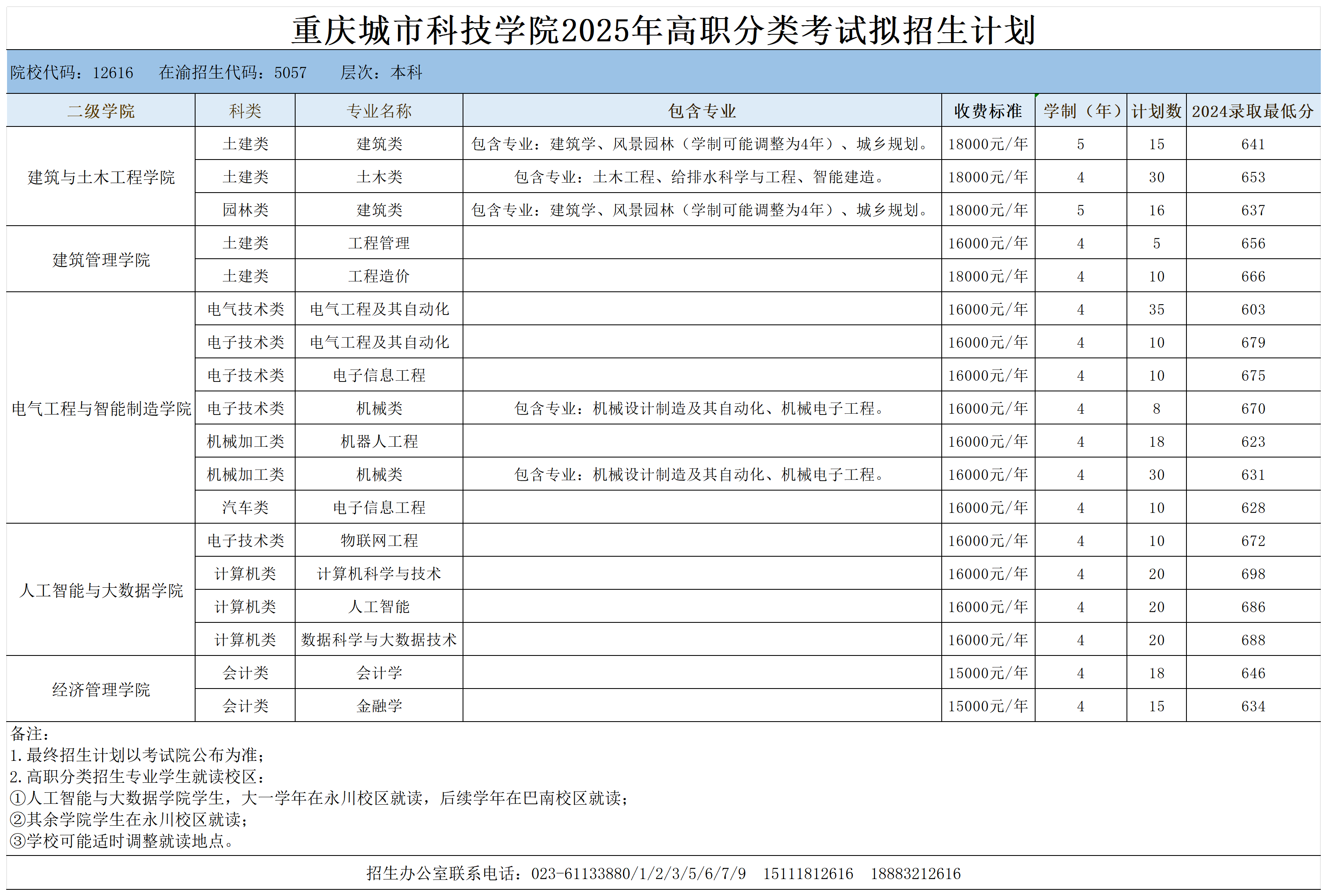 重庆城市科技学院2025年高职分类考试拟招生计划(点击查看高清大图)