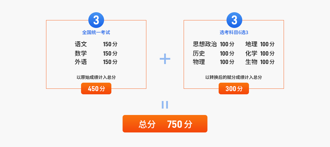 “3+3”模式,考试科目由3门全国统考科目和3门学业水平选择性考试科目组成。浙江省从思想政治、历史、地理、物理、化学、生物学、技术(含通用技术和信息技术)等7个科目中选择3科。上海高考总成绩为660分,其他省市高考总成绩为750分。